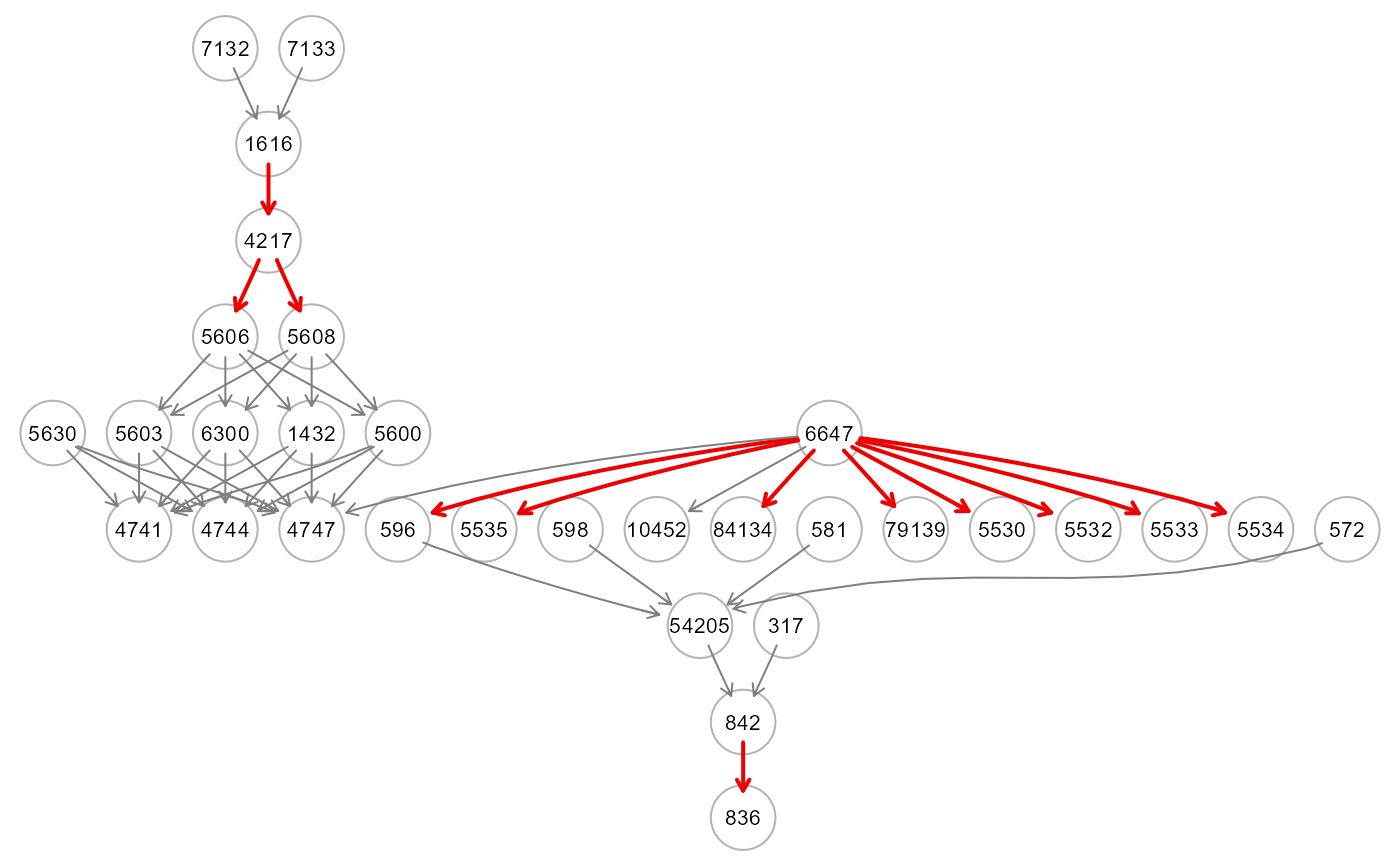 A list od three object: (i) est: a data.frame including the connections together with their LOCO values; (iii) gest: if the outcome vector is given, a data.frame of LOCO values per outcome levels; and (iii) dag: DAG with colored edges/nodes. If LOCO > thr, the edge is highlighted in red. If the outcome vector is given, nodes with absolute connection weights summed over the outcome levels, i.e. sum(LOCO[outcome levels]) > thr, will be highlighted in pink.